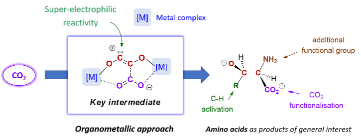 An example is the synergistic functionalization strategy (picture), which allows both the transformation of carbon dioxide and the activation of other small molecules, including alkanes. This original reactivity of carbon dioxide opens new avenues for its upgrading into elaborate scaffolds, such as amino acid motifs (Thomas, Simler, ANR JCJC MultiCO 2023-2026). A second approach concerns the photochemical Ln-OCO bond cleavage on high-valent lanthanide complexes for possible catalytic recycling.