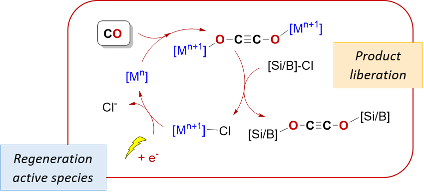 Carbon monoxide is a useful synthon for the industrial synthesis of C1 oxygenates such as methanol or acetic acid, as well as for the formation of synthetic fuels. In contrast, processes allowing the controlled formation of multicarbon oxygenated products from CO are relatively scarce. In this project, we use low-valent oxophilic metal complexes to induce the reductive coupling of CO. The molecule obtained from this reaction is then a platform for further functionalization into value-added products. We are especially investigating the use of electrochemical methods to regenerate the low-valent metal complexes in order to go towards catalytic applications.